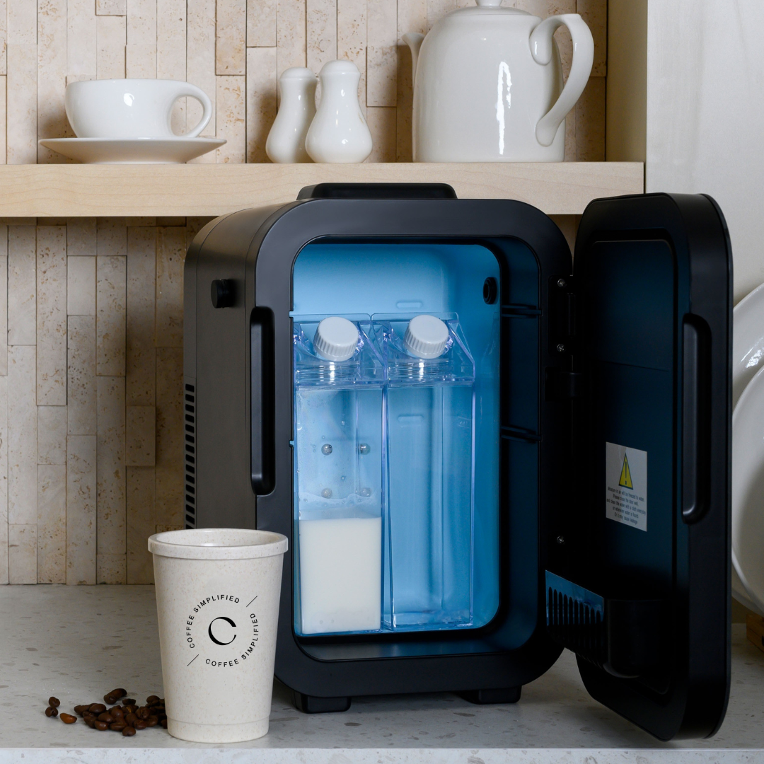 ✔️ Milk fridge + two milk containers – keeps milk fresh, perfectly chilled, and ready for frothing
