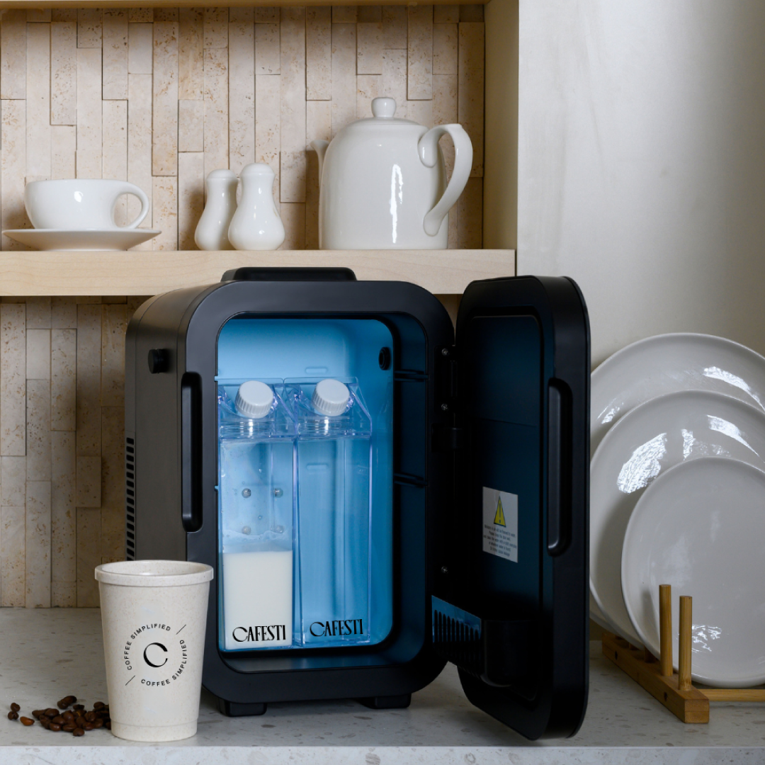 6L or 10L Vintage Cooler Box Milk Mini Fridge LED Screen, single cooling core with Tube next to Coffee Maker. Mini Fridge is ideal to keep your milk at the right temperature. Connects to your Cafesti coffee machine & includes either 2x1l Milk Containers or a single 1.8l Milk container